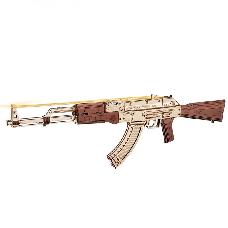 Assemble this replica of the famous AK47 and fire rubber bands in bursts or shot by shot, (2 firing modes).