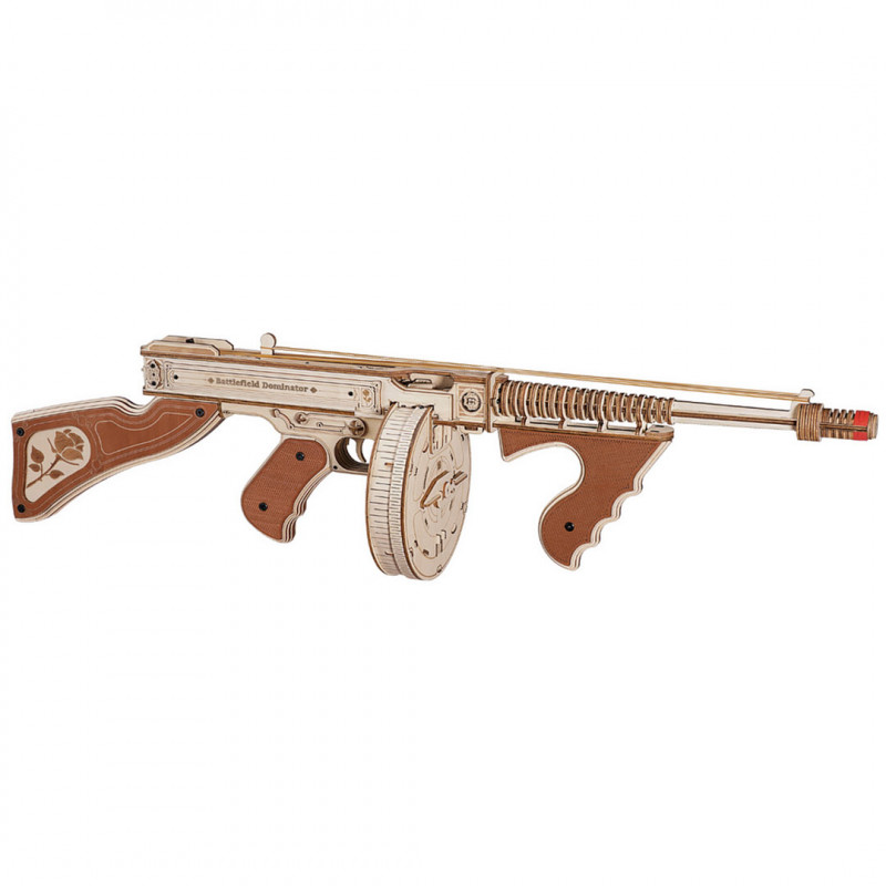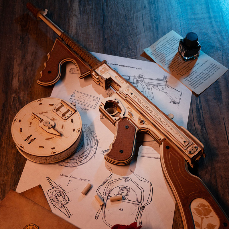 Assemble this magnificent Tompson machine-gun replica and fire rubber bands in bursts or single shots, with fake cartridges ejected during firing.