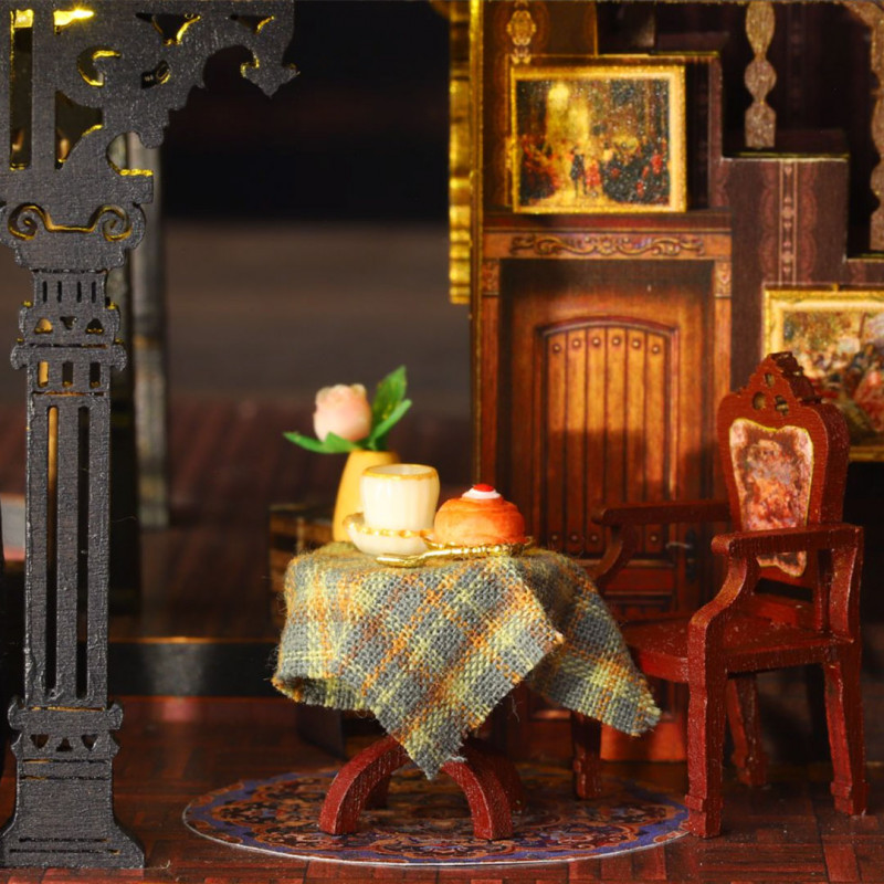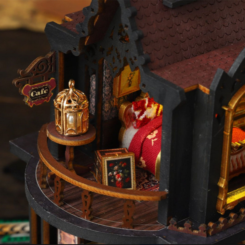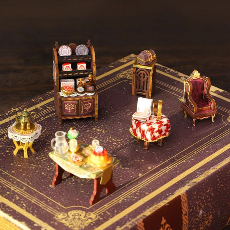 This miniature house is a detailed diorama designed to be placed on a desk, in a bedroom, or as an interior decoration.