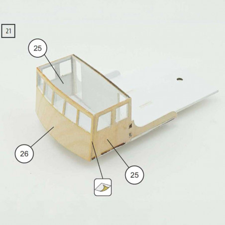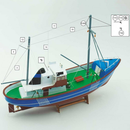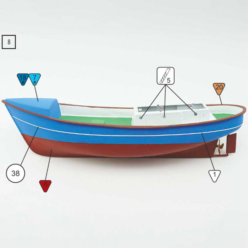 Model of a boat to build ideal for beginners, with ABS plastic hull and deck, wooden superstructure.