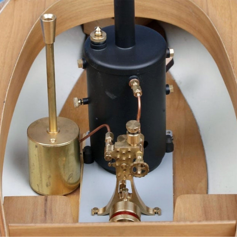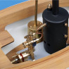 The "Anna" steam engine is a single-acting single-cylinder engine with a soft-soldered brass boiler heated with dry spirit (Esbit). This visually appealing engine delivers an astonishing performance that propels the steamboat Anna forward quickly and easily. It is not possible to control the steam engine. The boat is steered by the rudder only.