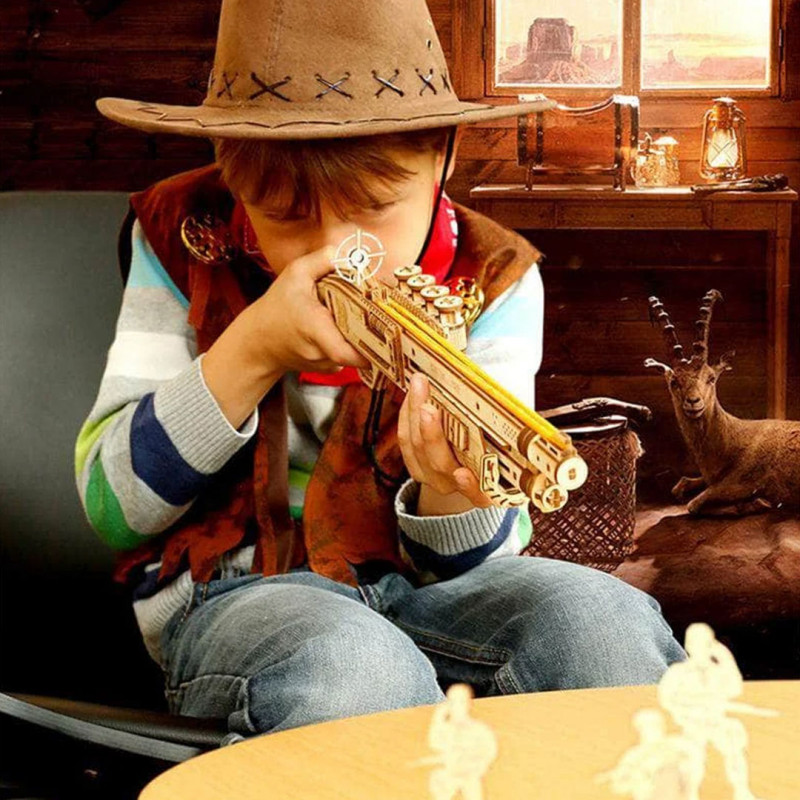- Assemble this shotgun and shoot rubber bands at the included targets