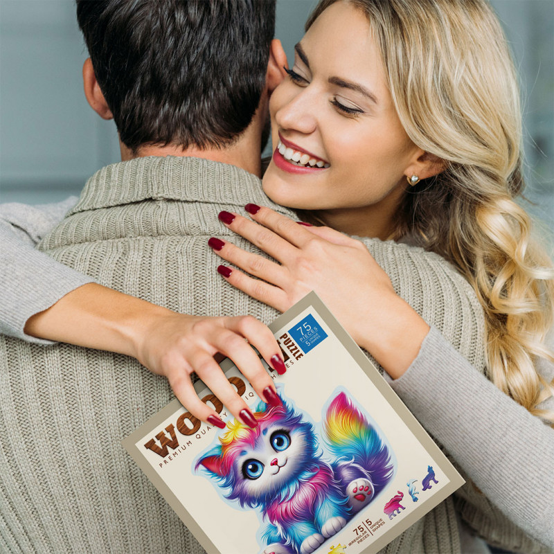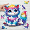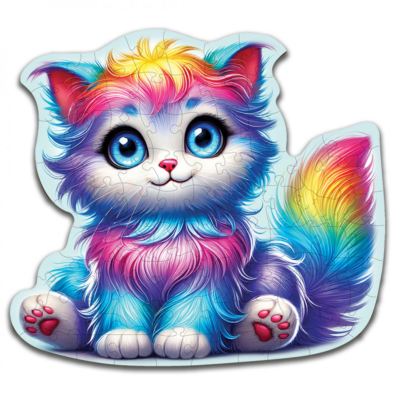 The Wooden Puzzle 75 Fantasy Kitty showcases a radiant feline adorned in vibrant rainbow hues.