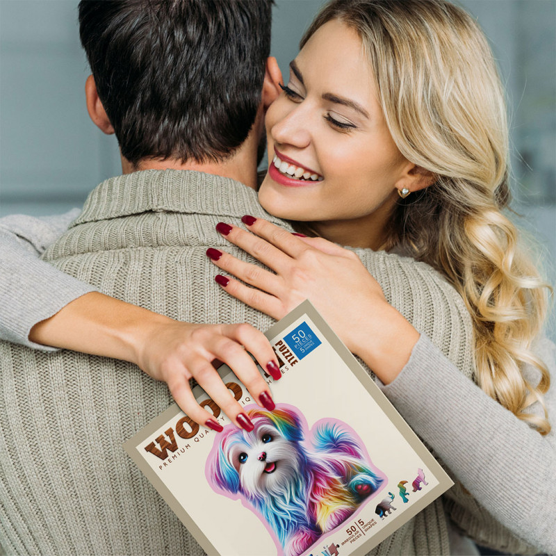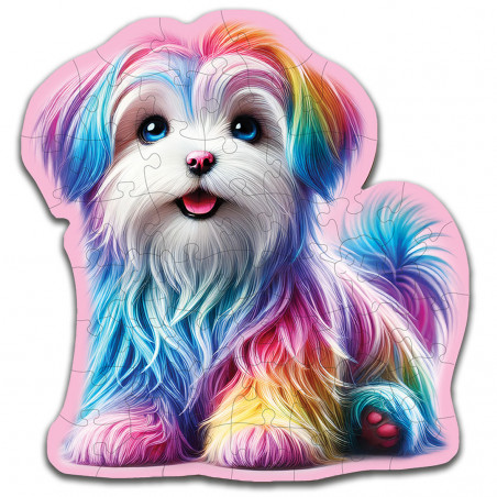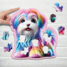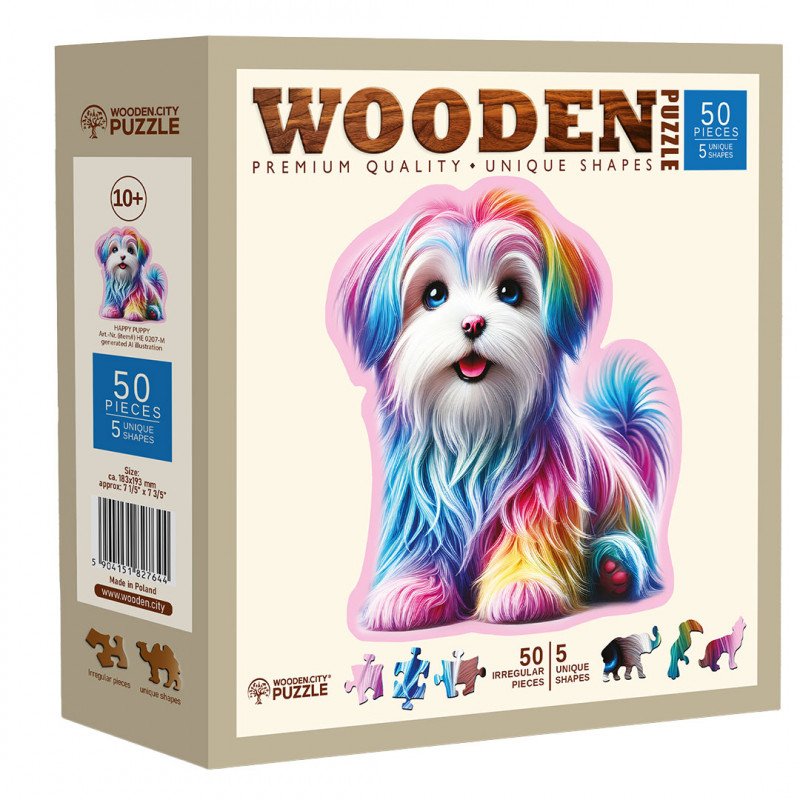 The Wooden Puzzle 50 Happy Puppy showcases a radiant canine adorned in vibrant rainbow hues.