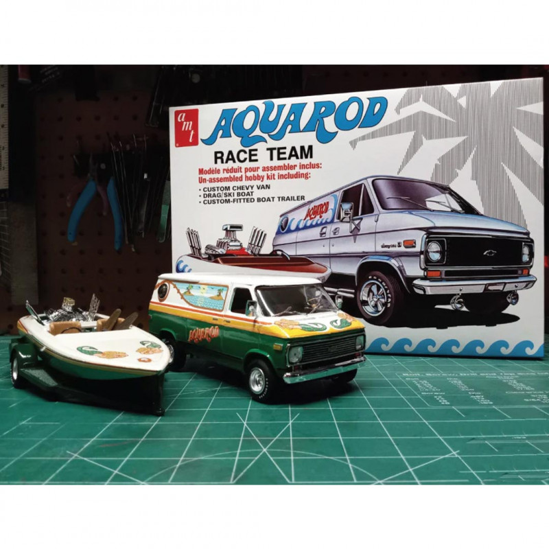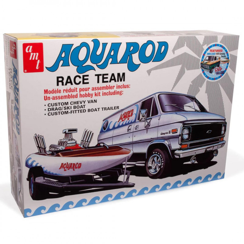 The AMT AQUAROD Race Team Van andBoat 1:25 model kit offers an exciting and detailed recreation of a racing team's van and boat combination.