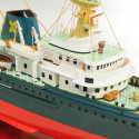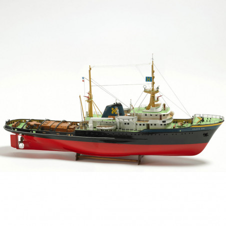 Remorqueur de haute mer, mis en service en 1963, d’un tonnage brut de 1539 tonnes, construit par Smit’s Schee Pswerten à Kinderdijk (Hollande). Longueur 77.50 m, largeur 12.35 m, tirant d’eau 6.90 m. Il est équipé de 2 chaloupes en fibre de verre pouvant recevoir 40 hommes. Coque moulée en plastique ABS, pont et superstructure en bois. Accastillages inclus dans la boite. Propulsion par moteur électrique. Ensemble R/C 2 voies. Equipement conseillé (non livré) : Moteur classe 550, Variateur de vitesse électronique, batterie et radio.