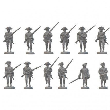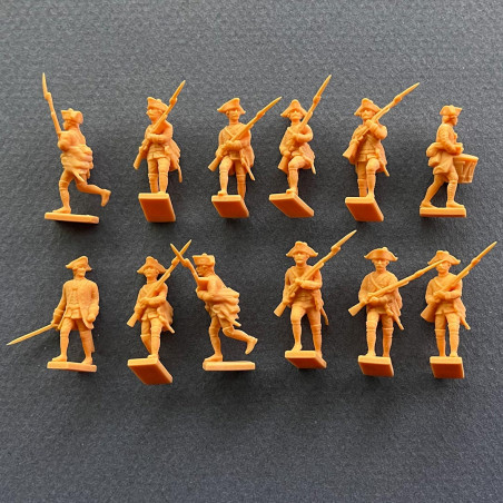 These figurines represent the formidable Hessian troops - German auxiliaries engaged by the British Crown during the American War of Independence. Renowned for their discipline, precision and striking uniforms, the Hessians played a key role in major battles such as White Plains and Fort Washington. Feared by many American settlers, their reputation was both respected and controversial.