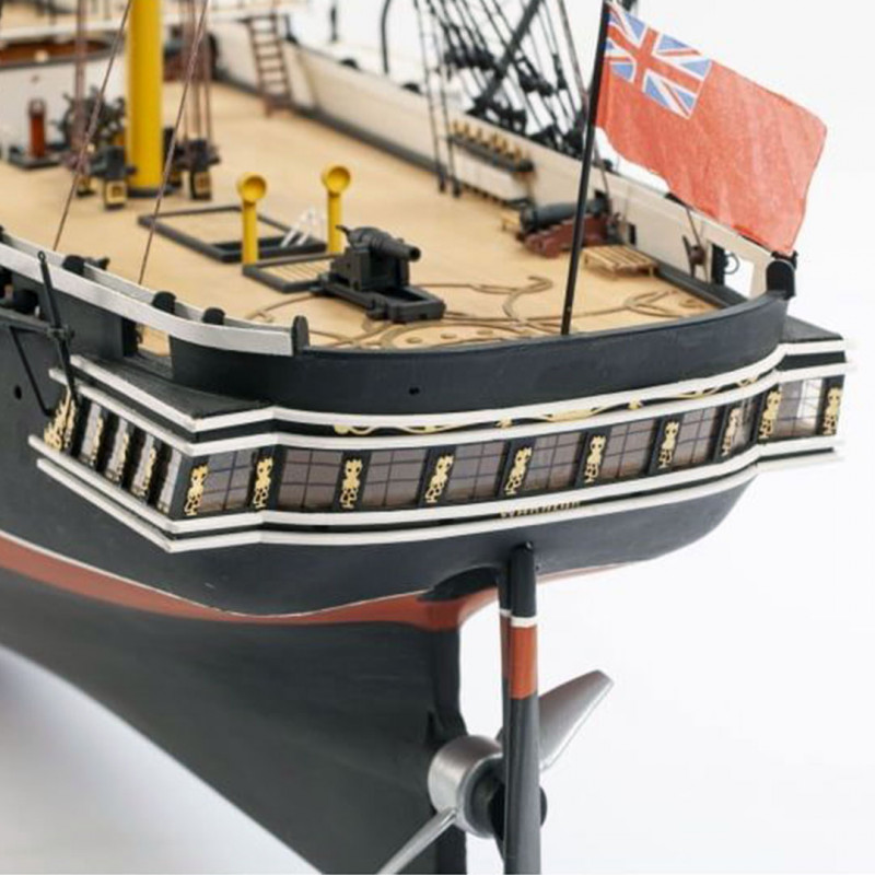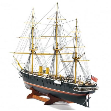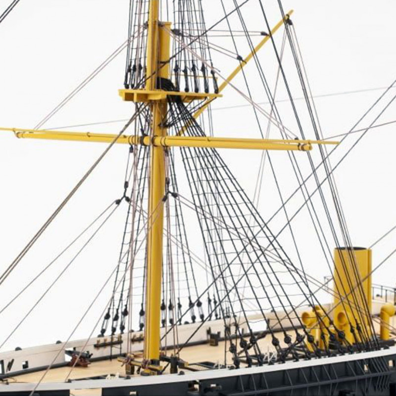Le Warrior a été conçu et construit en réponse à un programme de construction navale française agressif qui a vu l'introduction du premier navire de guerre blindé "La Gloire" conçue par le génial architecte naval Stanislas Charles Henri Dupuy de Lomé. Le navire a subi des modifications mineures après un essai en mer. En Juin 1862, il a commencé un service actif dans l'escadron de la Manche, et il patrouillait sur les eaux côtières. Après avoir introduit une révolution dans l'architecture navale, en 1864, le Warrior a été remplacée par des navires plus rapides, avec de plus gros canons et un blindage plus épais. La boîte contient toutes les pièces en bois pré-découpées au laser et les accastillages. Echelle: 1/100. Longueur: 147cm.