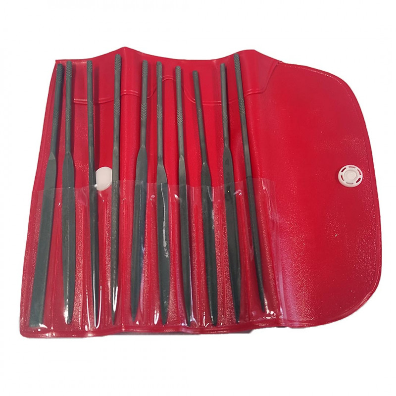 Assortment of 10 assorted fine files: round, square, triangular, finishing, half-round and flat.