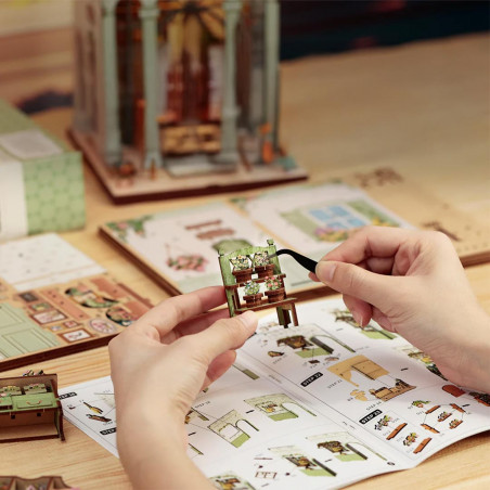 This Book Nook is a miniature diorama designed to be placed on a desk, a shelf, or in a bookcase.It allows you to have fun while developing manual skills and creativity.It tells a story, creates a cozy atmosphere, and decorates the house.Glue and batteries not included.Dust protection included.196 pieces to assemble.