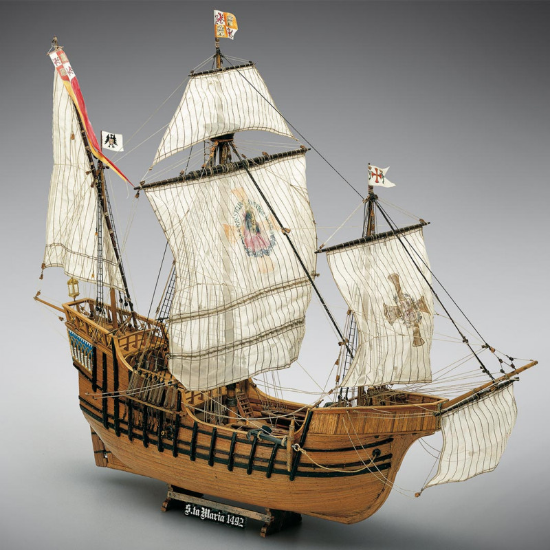Comment étaient les bateaux de la grande découverte du Nouveau Monde? La tradition parle toujours de trois caravelles, un type de bateau rapide avec une coque légère et une voilure consistant en plusieurs mâts et types de voiles. Les savants remarquent qu'en réalité la flotte de Colomb était formée de deux caravelles, la Nina et la Pinta, et d'une « Nao », la Santa Maria, un type de bateau à 3 mâts avec 2 voiles carrées et 1 voile latine, pourvu d'un gaillard d'avant qui le place dans la classe des Caraques. Toutefois la petite dimension de la Santa Maria ne doit pas tromper : la robustesse de la construction, unie aux connaissances anciennes du temps et à l'intuition du grand navigateur permirent une entreprise si grande. 1492, une date historique que tout le monde connaît.