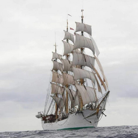 This large sailing ship has a steel hull and an impressive three-masted square rig, allowing it to sail in all the seas of the world.