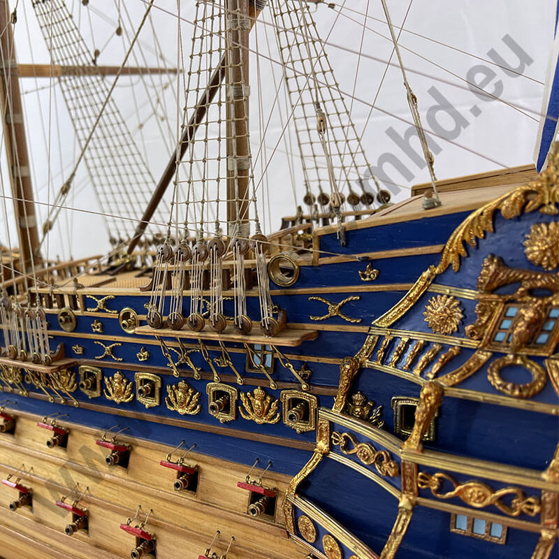 With its impressive dimensions, the Soleil Royal was a marvel of naval engineering of its time. Its impressive solid oak hull, covered with copper plates, proudly rose on the waves, carrying 104 cannons spread over three decks. With a length of nearly 61 meters and a width of 16 meters, this majestic ship could accommodate a crew of over 900 men in times of war.