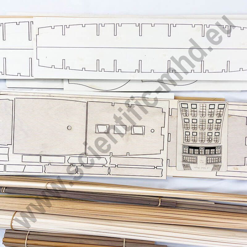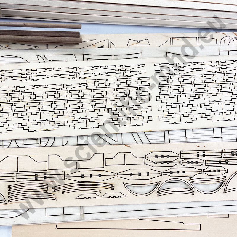 The wooden hull is covered with a double planking of walnut strips, all wooden parts are laser-cut for perfect and easy fitting of the pieces. The colors of the hull further enhance the decorative aspect of this model.
