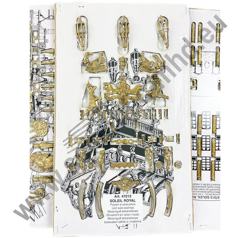 The 108 artillery pieces and fittings are made of cast brass with a polished and smooth finish. All remaining ornaments are also made of cast brass. All necessary fittings are either in walnut or brass and metal.