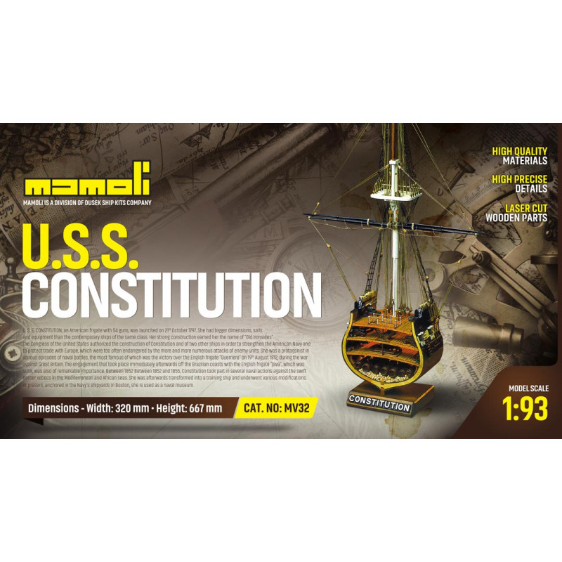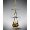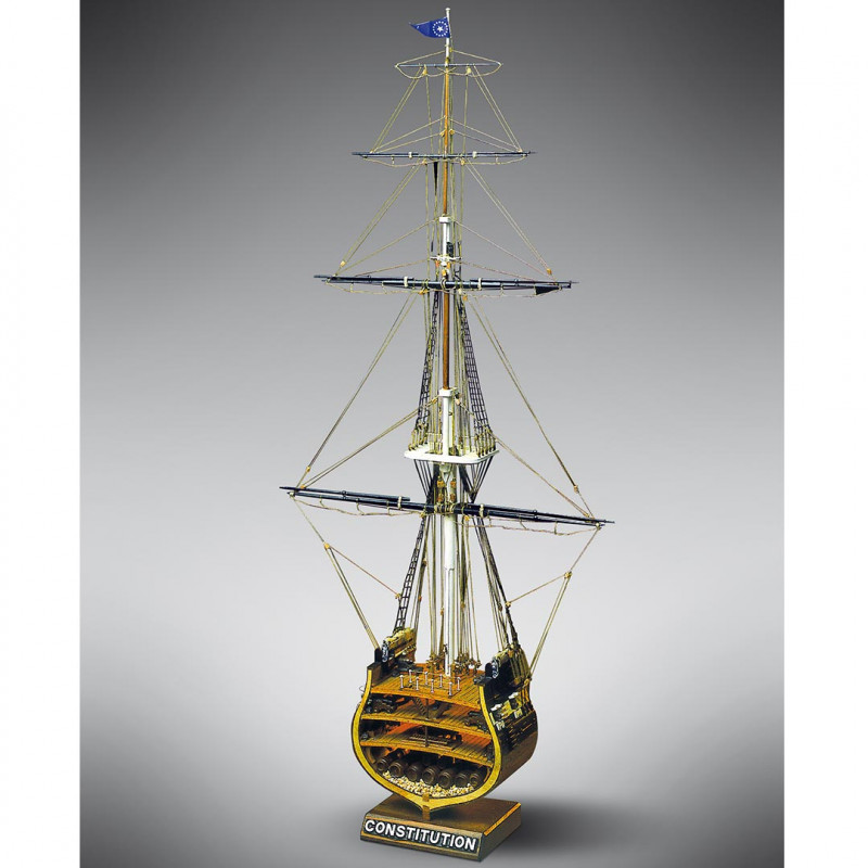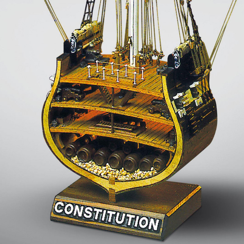Vue en coupe au grand-mât du modèle U.S.S. Constitution reproduisant d'une façon détaillée l'intérieur du vrai bateau lancé dans la seconde moitié du XVIII siècle. Structure composée de 10 demi-couples, dont l'assemblage est facilité par un outil spécial (équerre en plastique) fourni dans la boîte. Bordé intérieur et extérieur.