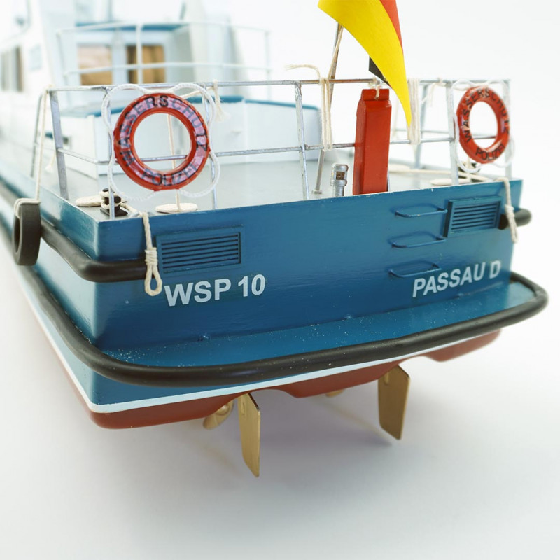 This vessel was built at the Bodan shipyard in Kressborn, Germany, and delivered to the Bavarian harbor police on June 30, 1989. The vessel is stationed at Passau on the Danube. A regional vessel, the WSP 10 is powered by 300 hp MAN diesel engines, enabling it to reach a speed of around 40 km/h. In normal service, the boat is crewed by two people and equipped with radar, echo sounder, autopilot, 4 radios and explosion protection. The boat and its crew have a wide range of tasks, such as surveillance, particularly of dangerous cargoes, and normal police duties. Another important task is environmental monitoring.